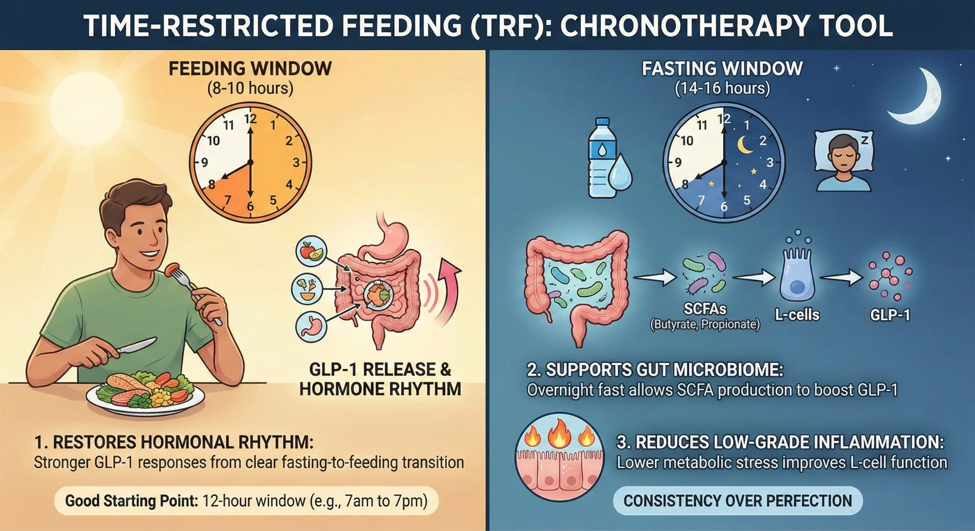 3. It reduces low-grade inflammation. Chronic low-grade inflammation — driven by poor diet and disrupted sleep — impairs the function of gut L-cells. TRF, by reducing metabolic stress, helps restore a healthier gut environment where GLP-1 production can thrive.